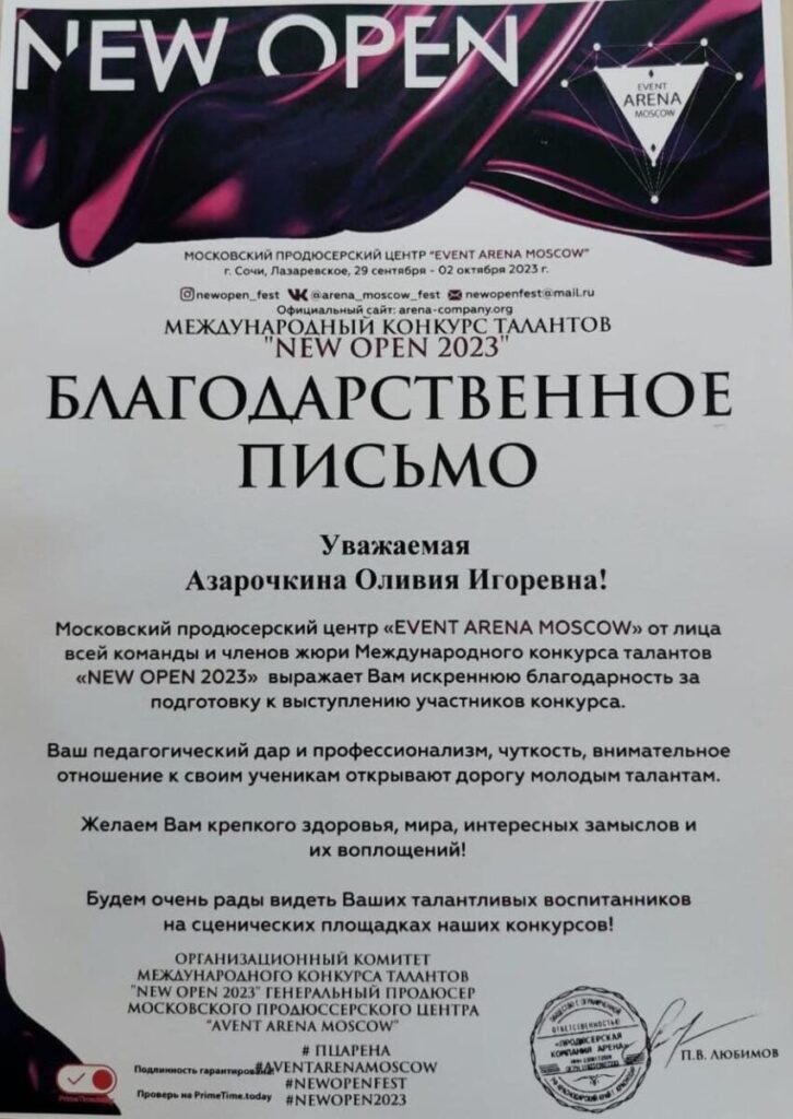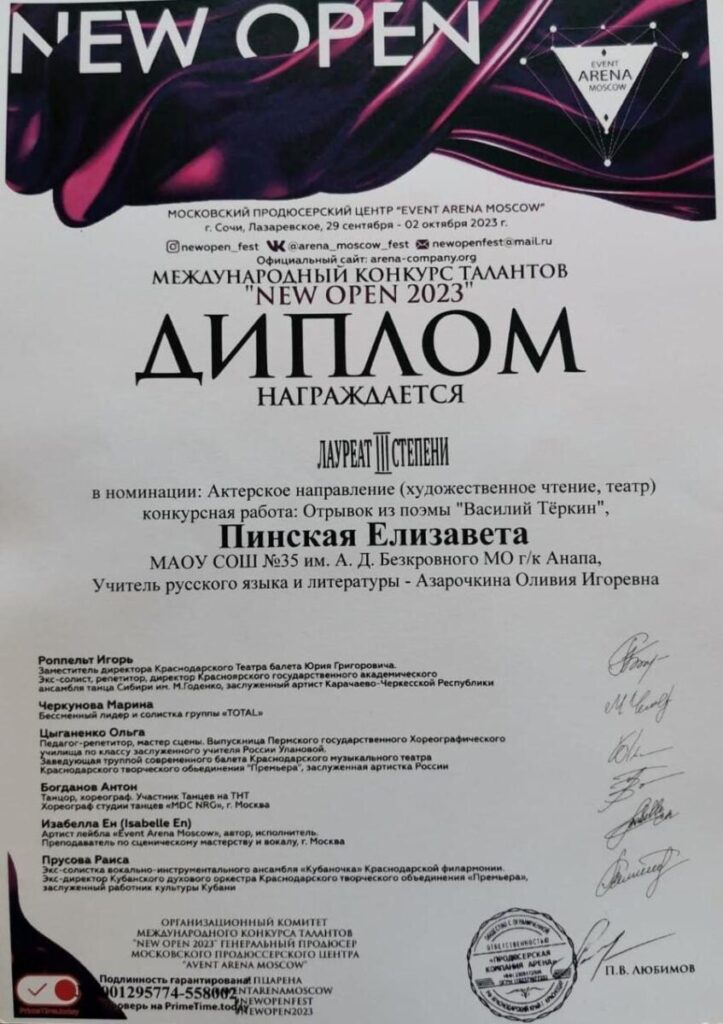 Пинская Елизавета заняла 3 место в номинации ,актерское направление (художественное чтение, театр).